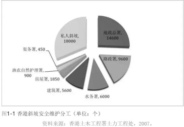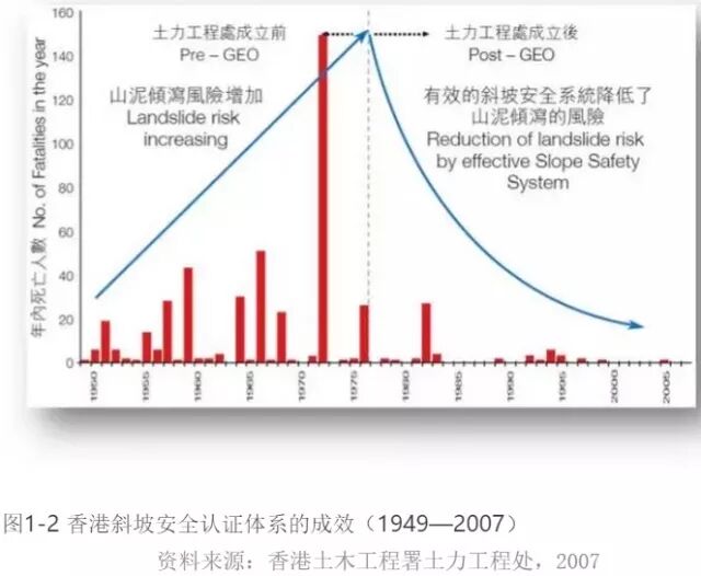 通过收集事实、积累知识,设定规范、建章立制,以及识别鉴定、评估检查,土力工程处不仅承担了检查所有政府部门维护的公共斜坡(八个政府部门负责维修斜坡,但检查权归属土力工程处,参见图1-1)和公私机构所有岩土工程的责任,还有权命令私人业主维修私人斜坡。自20世纪80年代中期以来,土力工程处还建议香港政府统一安置了74800位原来生活在危险地带的寮屋居民,大大减少了斜坡崩塌事故及其灾害后果,斜坡事故水平降低了一大半,死亡人数大大减少(参见图1-2),1995年以后就没有再发生过多人死亡的斜坡安全事故,从而成为政府公共建设的鲜明典范,中国香港特区的斜坡安全水平已经领先于意大利、德国、澳大利亚、加拿大和美国等发达国家。