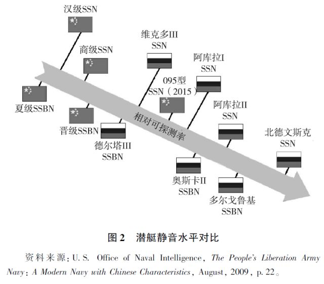 美国的核潜艇相对于094艇而言,有着极大的静音优势。根据公开文献的评估,美国的洛杉矶级攻击型核潜艇相对于俄罗斯的维克托III型核潜艇(Victor III)有10~20分贝的静音优势,而后者还要远比094艇安静。更低的噪声水平意味着探测距离上的优势,即美国核潜艇对094艇的探测距离,要远大于094艇对美国核潜艇的探测距离,这样美国核潜艇可以在合适的距离上一直保持对094艇的跟踪,而后者完全不会察觉。中美在潜艇与反潜领域的竞争格局大致相当于20世纪六七十年代的美国和苏联之间的竞争,当时美国对苏联核潜艇也有很大的静音优势,因此,美国攻击型核潜艇可以持续跟踪苏联战略核潜艇。约翰·沃克(John A. Walker, Jr.)间谍案使得苏联意识到美国对苏联战略核潜艇的跟踪能力,苏联此后开始花大力气改进潜艇的静音性能。从80年代起,苏联核潜艇的静音水平得到了大幅度提升,美国海军可以轻松跟踪苏联潜艇的“惬意时光”得以终结。
