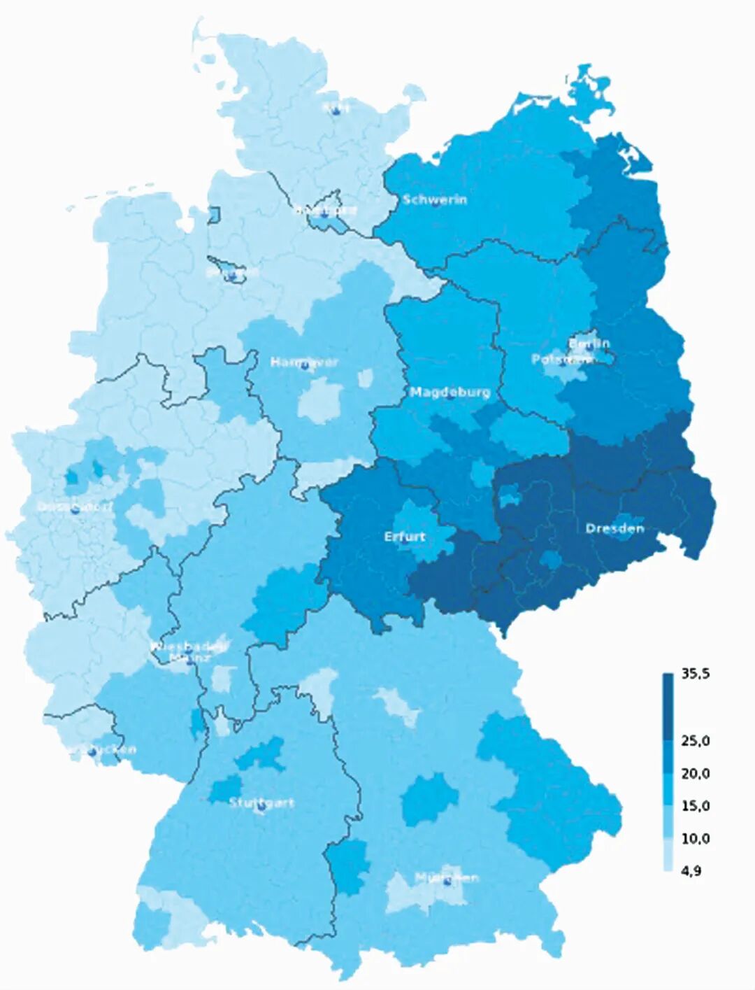 本文认为,2017年德国联邦议会选举结果是系统考察上述研究问题的可行对象。首先,尽管德国统一已有近30年,但德国内部各个州之间的宏观经济状况仍然有很大差异,这种差异不仅存在于德意志民主共和国(东德,1949—1990年)各州和德意志联邦共和国(西德,1949—1990年)各州之间,也存在于统一后的德国各州内部选区之间。其次,目前德国各州之间、各州内部选区之间的移民数量和所占比例差异很大,以首都柏林为例,其境内选区米特区内外来移民的比例高达29%,而另一个位于柏林的选区马赞区内外来移民比例仅为66%。最后,也是最重要的一点,最新联邦议会选举的统计结果显示,德国右翼民粹政党德国另类选择党在德国境内各选区之间的得票率差异很大(见图1)。该党在一些联邦州的选区(主要是原东德地区选区)获得了超过20%的得票率,但在另一些选区,如汉堡市的阿尔托纳选区,该党仅获得55%的得票率。由此可见,以选区为单位,各地对右翼民粹政党的支持度存在很大差异。