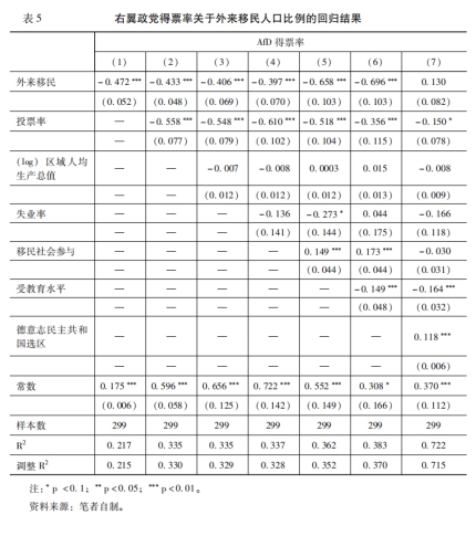 如表5列(1)—列(6)所示,在未考虑反建制因素的情况下,外来移民与AfD得票率之间存在显著的负相关关系,即移民比例越高的选区,AfD的支持率越低。但在列(7)完整添加各项控制变量后,笔者发现,除外来移民与选民右倾化之间的显著负相关性消失外,投票率与因变量之间的负相关关系显著性也从1%水平下降到10%。同时,德意志民主共和国选区这一变量显示了与AfD支持率的高度正相关性。这一结果说明,与移民议题相比,从全国的层面来看,对现有政治体制的不满是AfD选民更重要的动机来源,前文中所假设的外来移民可能引起的威胁感暂时无法通过这一统计结果描述出来。