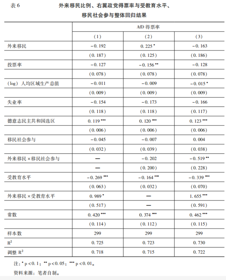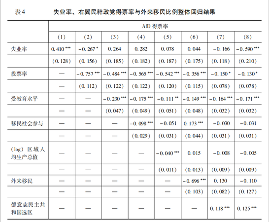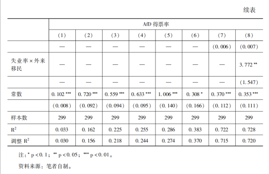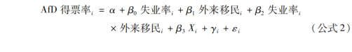 接下来,对假设二和假设三的验证,都围绕外来移民和右翼民粹政党支持率之间的关系展开,这一估计的基础模型为: