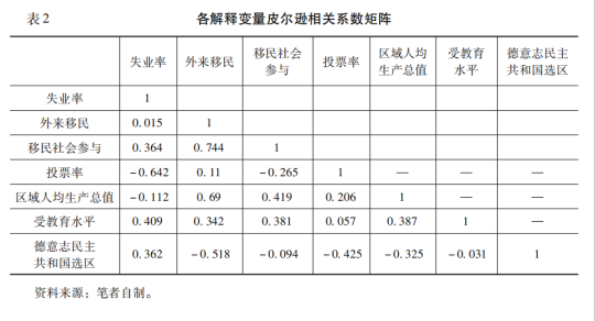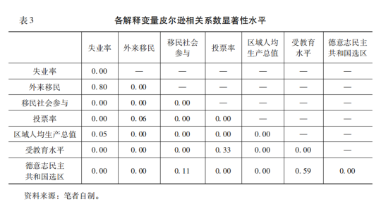 在进行模型估计前,我们首先对相关变量做出描述性统计(见表1)。由于“德意志民主共和国选区”被设置为虚拟变量,故在此暂不做均值、标准差、最大值和最小值描述。表2显示为相关性检验后得到的各变量间皮尔逊相关系数(pearson correlation),用以考察这些变量之间是否存在高度相关性,以避免可能存在的多重共线性影响对假设检验的准确性。其中,相关性最高的两个变量是外来移民和移民社会参与,两者间相关系数为0.744,但并未达到0.8的高度相关基准线。表3显示了各解释变量之间皮尔逊相关系数的显著性水平,其中,失业率与外来移民、受教育水平与投票率、受教育水平与德意志民主共和国选区、移民社会参与与德意志民主共和国选区之间相关性均在高于0.1水平上具有显著性差异,外来移民与投票率之间的相关性则在0.05—0.1间的水平上具有显著差异。这些高于0.05的显著性水平说明变量之间的相关系数存在错误的可能性较高。为避免可能存在的误差,我们加入各解释变量方差膨胀因子作为解释多重共线问题的工具。由表1可知,各个解释变量的方差膨胀因子均远小于10。因此我们可以认为,变量之间不存在严重的多重共线问题,可以按照前文中的估计进行回归分析。