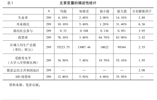 本文以2017年德国联邦议会选举结果和早前的选区结构数据为观察样本。这里需要说明的是,在德国每四年举行一次的联邦议会选举中,选民持有两张选票:第一张选票用来选举本人所在选区中的一位政治家进入联邦议会担任议员,该票用来“选人”;第二张选票用来选举自己所支持的政党,该票将用来决定议会中每个政党席位的数量并决定德国联邦议会的权力格局。本文所使用的政党得票率数据为选民第二票的选举结果数据,各选区右翼民粹政党第二张选票得票率为因变量,宏观经济和外来移民分别为两项涉及经济和社会背景的核心自变量。