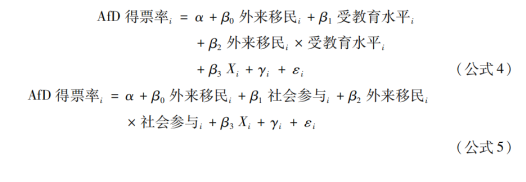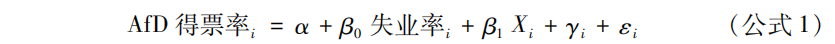 该模型与公式1原理一致。模型中的i表示选区,被解释变量AfD得票率i表示选区i在本次德国联邦议会选举中右翼民粹政党德国选择党的得票率。核心解释变量为外来移民i,即选区i内,外来(国)人口所占比例。Xi为会影响右翼政党得票率的主要控制变量,在此模型中主要有:失业率、投票率、人均区域内生产总值和是否为德意志民主共和国地区选区,另外在两项不同的估计中分别加入移民社会参与度和受教育水平。γi和εi分别表示与选区i有关的各项不可观测因素和随机项。